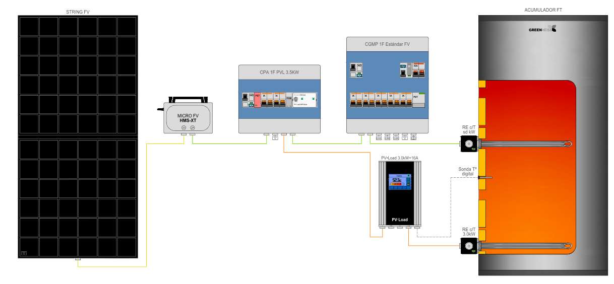 - Resistencia Eléctrica: Una resistencia de 3.500 W ya viene incluida y preinstalada en el propio controlador PV·Res. Esto elimina la necesidad de adquirir y conectar una resistencia por separado, facilitando la instalación.